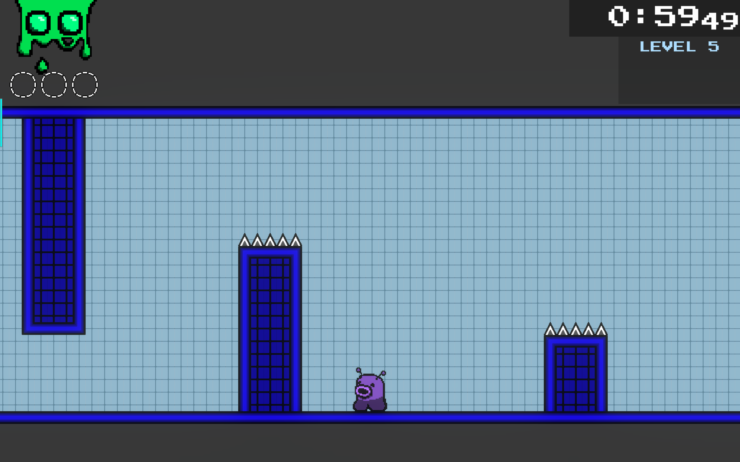 Level 5 is based around these trampoline platforms, which bounce Nasu back up to the height he initially fell from before bouncing on it. The player first navigates between some vertical columns, which come up throughout the level.