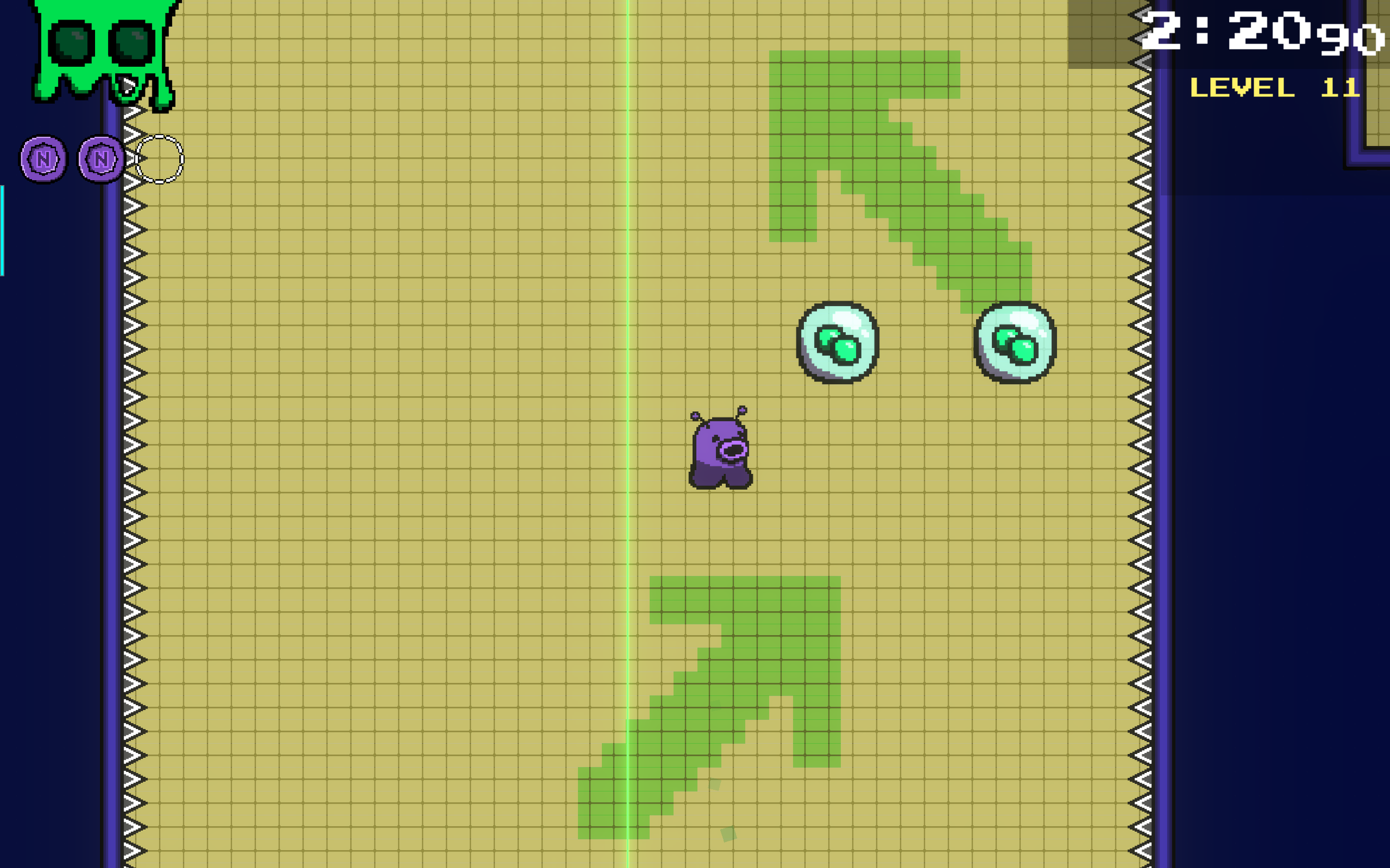 This level also begins with a quick dash across a horizontal section where the player needs to be aware that a time-based laser will turn on again soon.