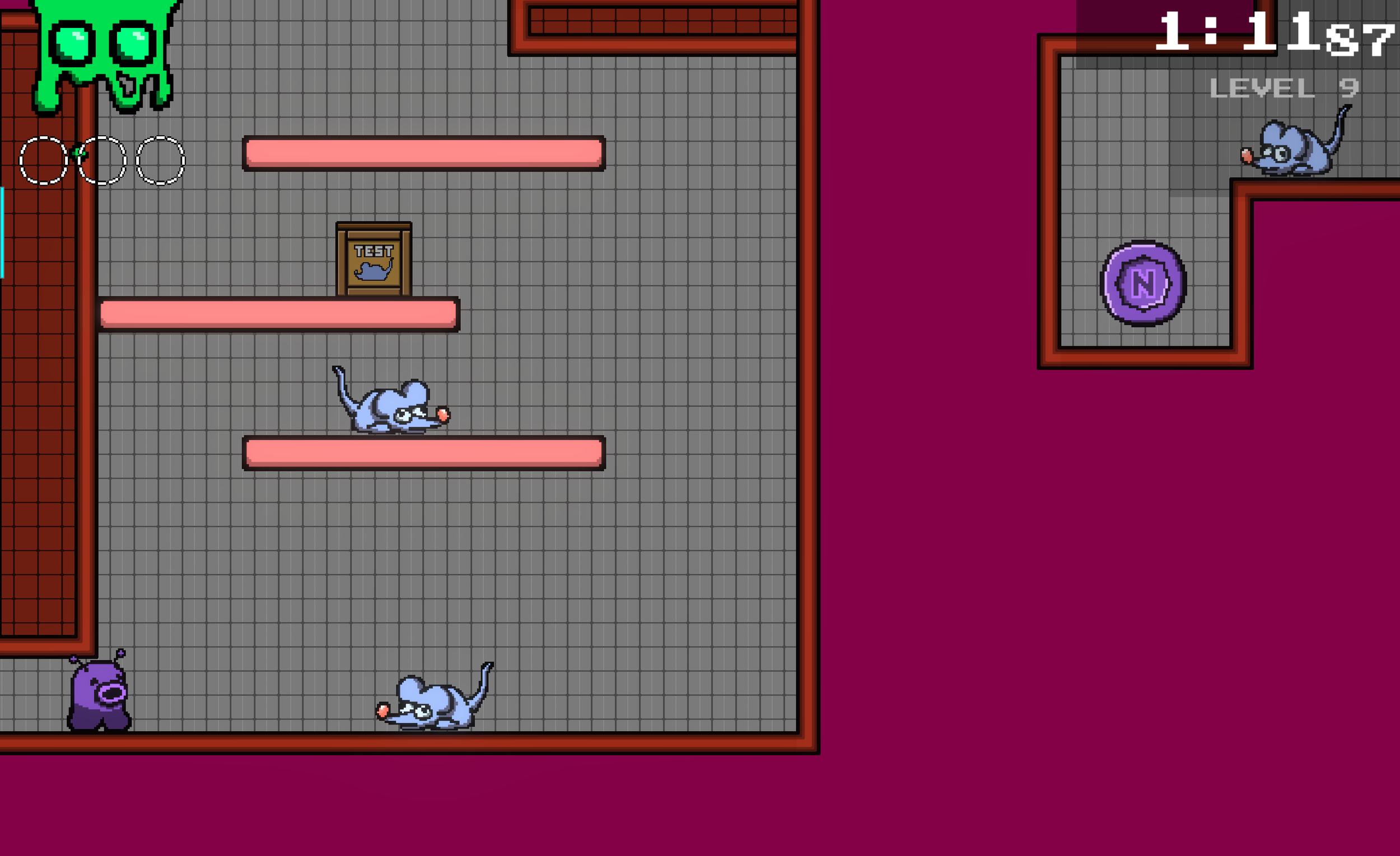 Then as one final challenge, rats descend from platforms above after being spawned from boxes. Having to progress vertically while rats make their way down each platform is substantially more challenging than navigating past them horizontally.