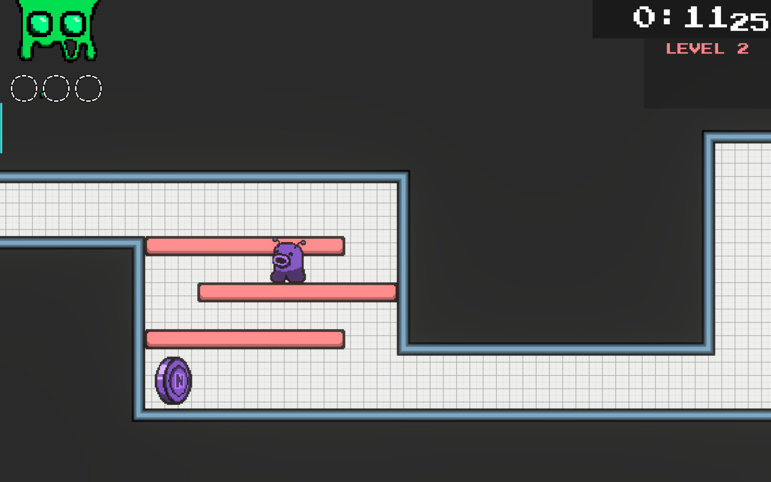 This next room cleverly uses two time-based lasers to dictate when you can enter and leave the room. In this room, the player needs to figure out that they must stall in the air for as much time as possible, making full use of every shot from all three bullet bubbles before exiting the room to the right.