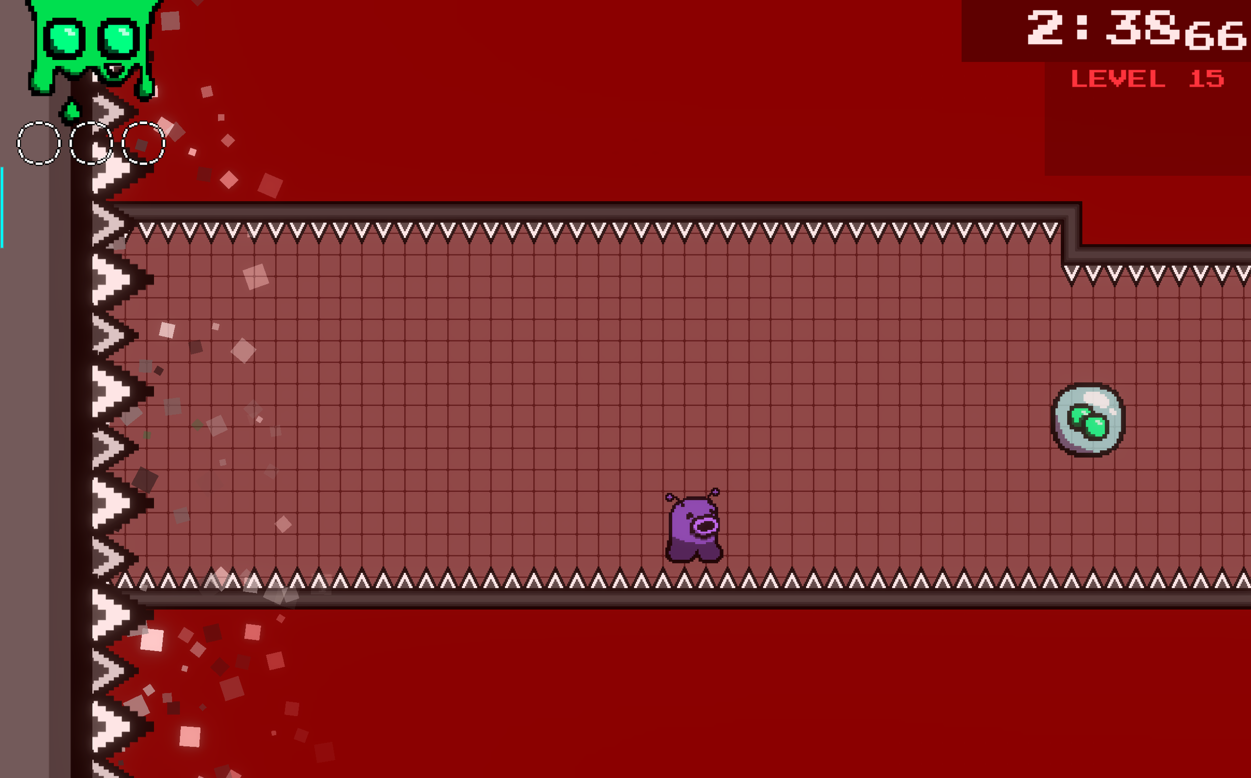 Level 15 is a gauntlet of ridiculous challenges the player faces while running from a deadly wall of spikes. First, one spike pit. Then a spike pit that requires two shots. Then two consecutive spike pits.